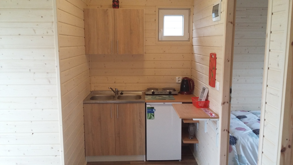 W każdym domku znajduje się lodówka, płyta elektryczna, czajnik elektryczny, akcesoria kuchenne.