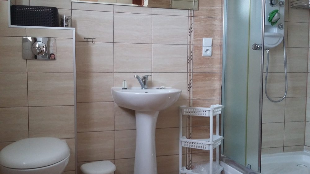 W domu jest łazienka wyposażona w kabiną prysznicową.