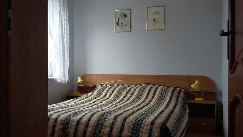 Sypialnia z łóżkiem małżeńskim, wyposażona w pościele i poszewki.